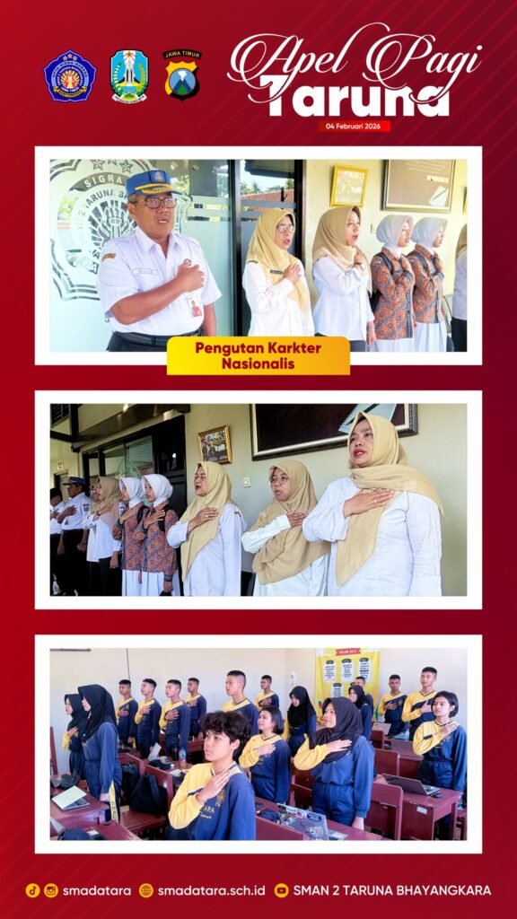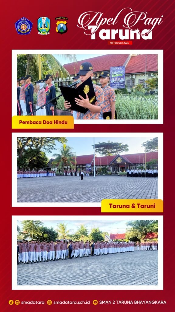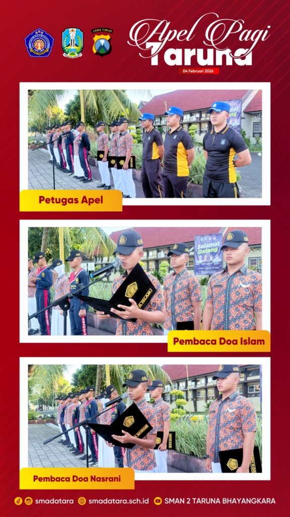 SMA Negeri 2 Taruna Bhayangkara Jawa Timur melaksanakan Apel Pagi pada Rabu, 4 Februari 2026, sebagai kegiatan rutin dalam rangka pembinaan karakter. Kegiatan ini diikuti oleh seluruh Taruna dan Taruni, Dewan Guru, Tenaga Administrasi Sekolah (TAS), serta para pengasuh, yang berlangsung dengan tertib, khidmat, serta penuh semangat kebersamaan.