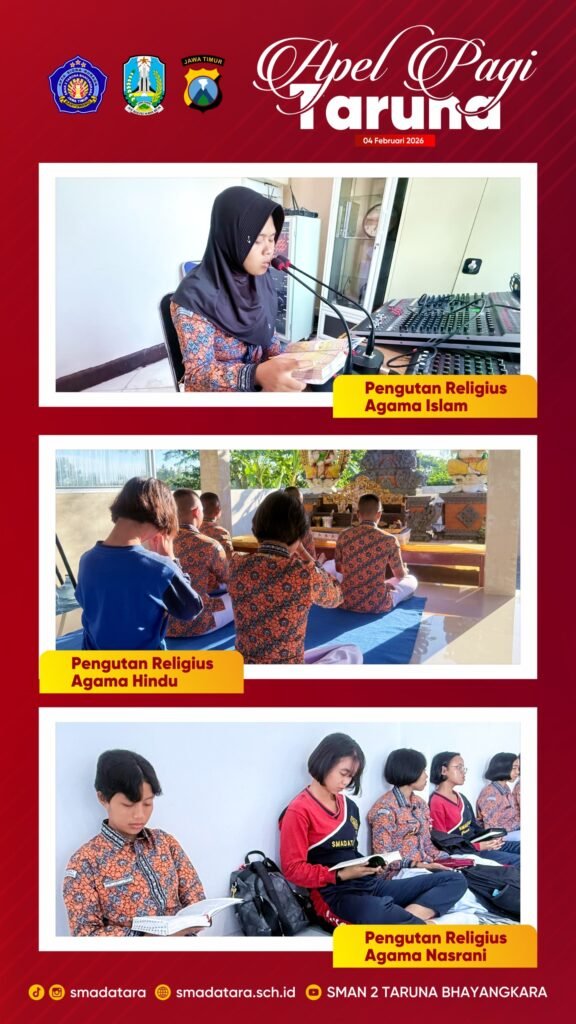 Rangkaian apel pagi diawali dengan penguatan karakter nasionalis sebagai bentuk penanaman nilai cinta tanah air, kedisiplinan, serta loyalitas terhadap bangsa dan negara. Selanjutnya dilaksanakan penguatan religius sesuai dengan keyakinan masing-masing melalui pembacaan doa dan kegiatan keagamaan Islam, Hindu, dan Nasrani, sebagai perwujudan sikap toleransi, penghormatan terhadap keberagaman, serta pembinaan karakter spiritual Taruna dan Taruni.