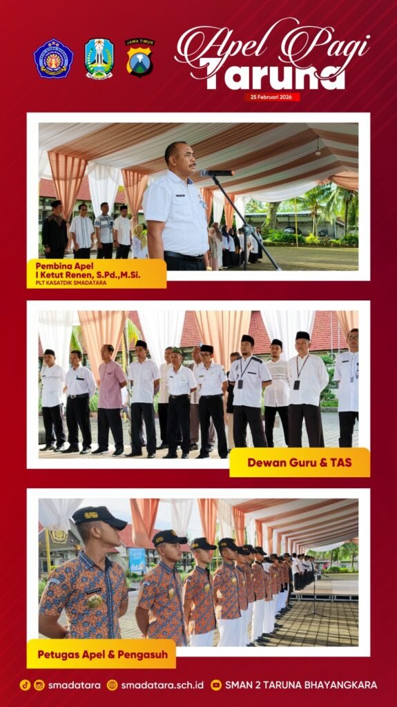 Apel pagi taruna di SMAN 2 Taruna Bhayangkara Jawa Timur berlangsung dengan tertib dan penuh khidmat, dipimpin oleh Plt. Kasatdik, I Ketut Renen, S.Pd., M.Si. Kegiatan ini menjadi sarana penanaman disiplin, tanggung jawab, serta penguatan karakter ketarunaan bagi seluruh peserta didik.