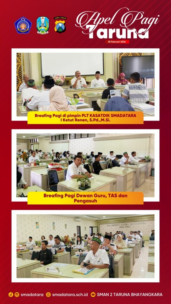 Setelah apel pagi, kegiatan dilanjutkan dengan briefing kepada GTK (Guru dan Tenaga Kependidikan). Briefing ini bertujuan untuk menyampaikan informasi kedinasan, menyelaraskan program sekolah, serta memperkuat koordinasi dalam pelaksanaan tugas pendidikan dan pembinaan taruna. Melalui kegiatan ini diharapkan seluruh GTK semakin solid, profesional, dan siap memberikan layanan pendidikan terbaik bagi peserta didik.