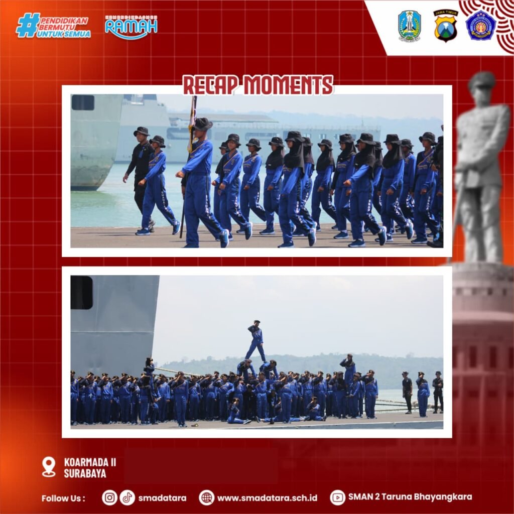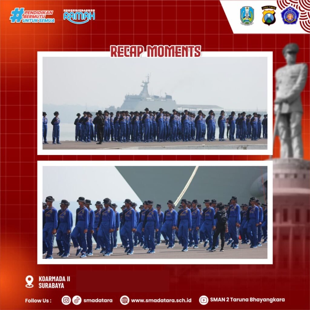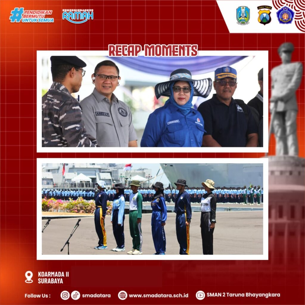 Kegiatan persiapan gladi bersih Pembaretan Taruna Jawa Timur yang dilaksanakan di Markas Komando Armada II (Koarmada II) Surabaya berlangsung dengan tertib dan penuh semangat. Kegiatan ini turut dihadiri oleh Kepala Dinas Pendidikan Provinsi Jawa Timur, Bapak Aries Agung Paewai, S.STP., M.M., serta Kepala Bidang Pembinaan Pendidikan SMA (PPSMA), Ibu Suhartatik, S.Pd., M.Psi.