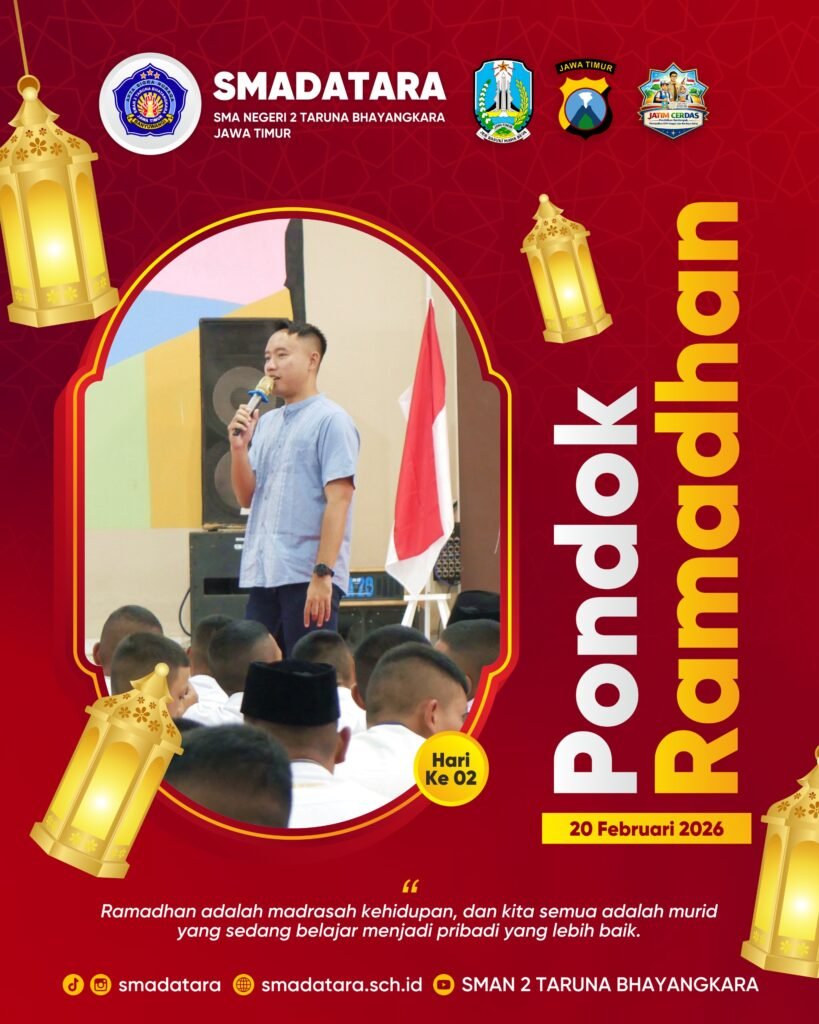 Memasuki hari kedua kegiatan Pondok Ramadhan SMADATARA 2026, suasana pembinaan spiritual di SMAN 2 Taruna Bhayangkara Jawa Timur semakin terasa khidmat dan penuh makna. Berbagai materi keislaman, motivasi, serta refleksi diri diberikan untuk memperdalam pemahaman peserta didik tentang nilai-nilai Ramadhan sebagai madrasah kehidupan.