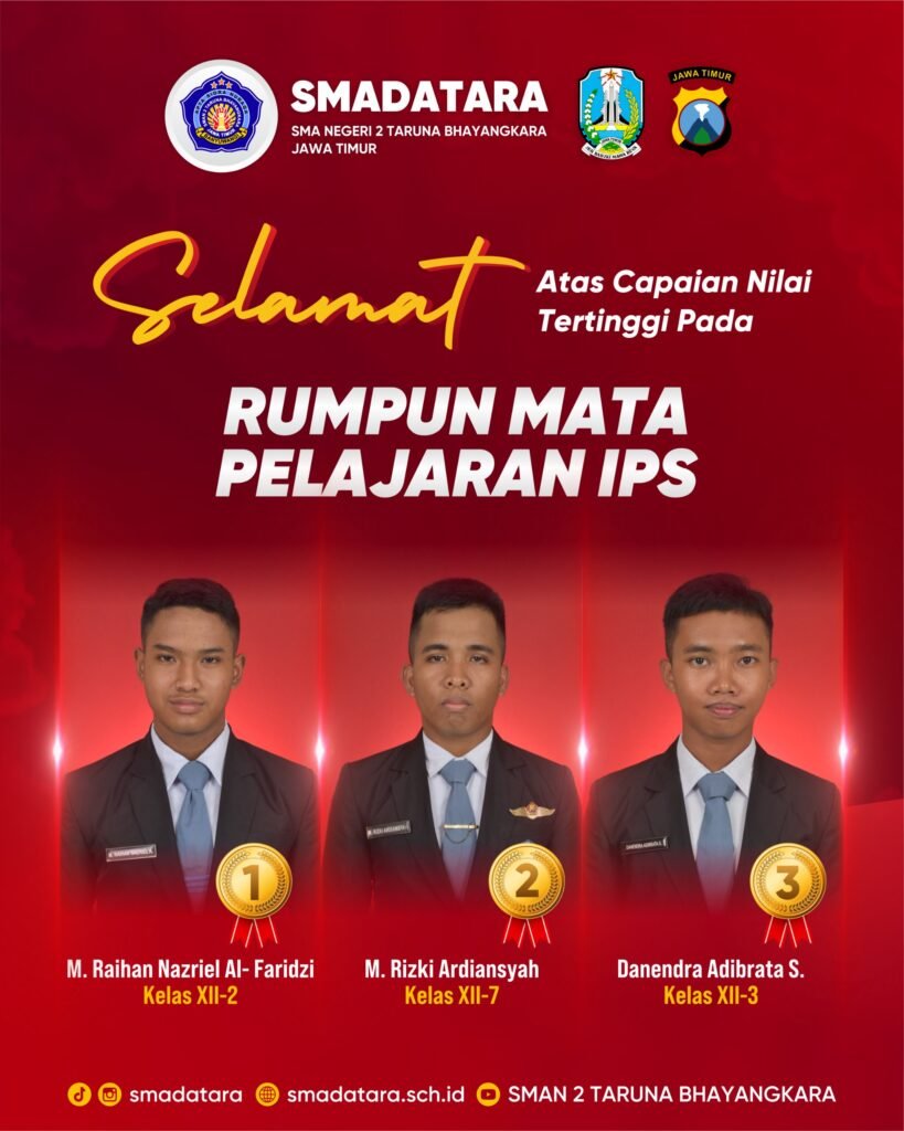 Keluarga besar SMAN 2 Taruna Bhayangkara Jawa Timur menyampaikan selamat dan apresiasi setinggi-tingginya atas capaian yang diraih. Diharapkan prestasi ini dapat menjadi inspirasi bagi seluruh taruna dan taruni untuk terus meningkatkan semangat belajar, menjaga konsistensi prestasi, serta mengembangkan potensi akademik secara optimal sebagai bekal menghadapi jenjang pendidikan berikutnya.
