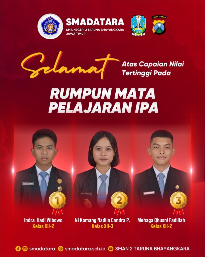 Sementara itu, pada rumpun mata pelajaran IPA, prestasi tertinggi diraih oleh Indra Hadi Wibowo (Kelas XII-2), Ni Komang Nadila Candra P. (Kelas XII-3), dan Mehaga Qhusni Fadillah (Kelas XII-2). Capaian ini menunjukkan kemampuan analisis, ketelitian, serta pemahaman ilmiah yang baik dalam bidang sains.