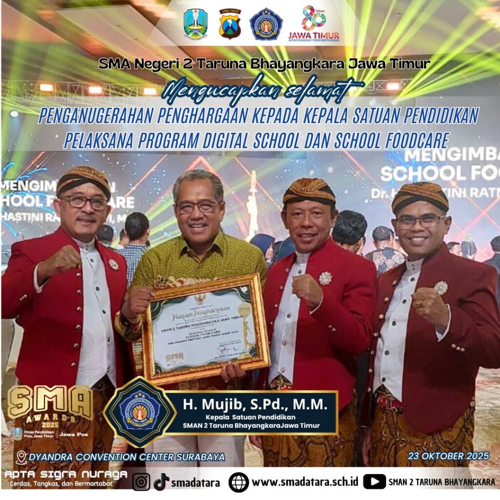 SMAN 2 Taruna Bhayangkara Jawa Timur kembali menorehkan prestasi membanggakan dengan menjadi pelaksana Program Digital School dan School Food Care (SFC). Kedua program ini merupakan inisiatif untuk mendorong transformasi pendidikan dan kepedulian terhadap kesehatan warga sekolah, sekaligus menjadi bukti nyata komitmen sekolah dalam menghadirkan inovasi berkelanjutan.
