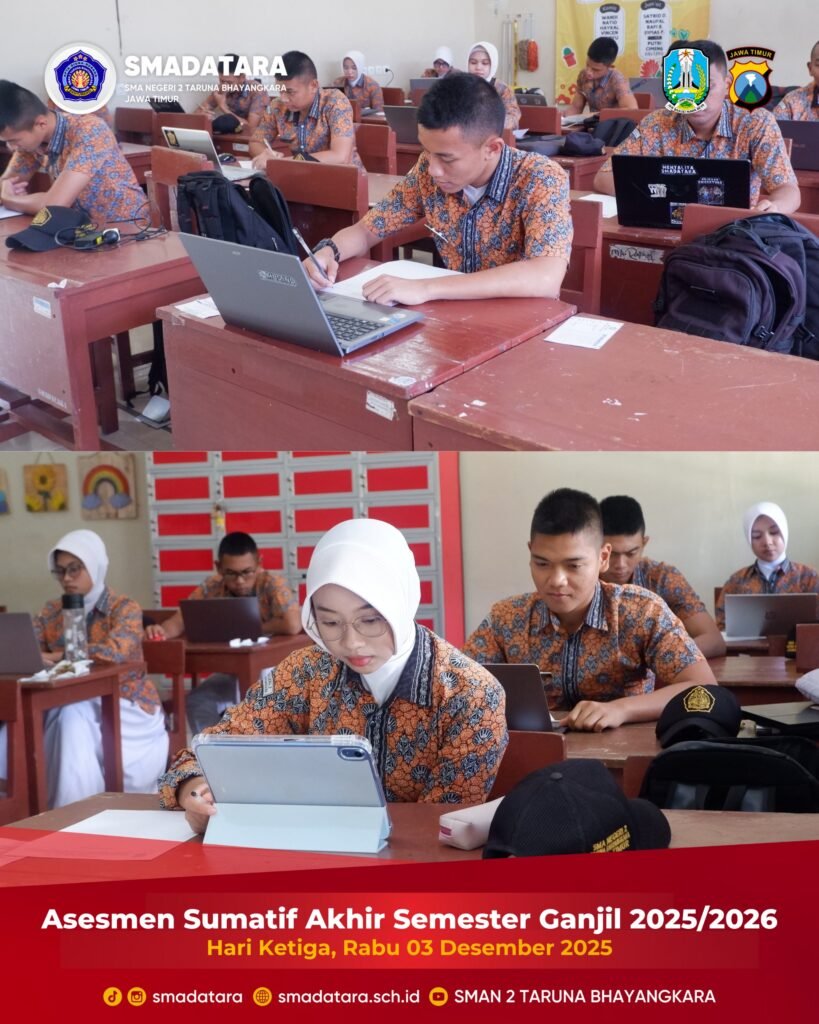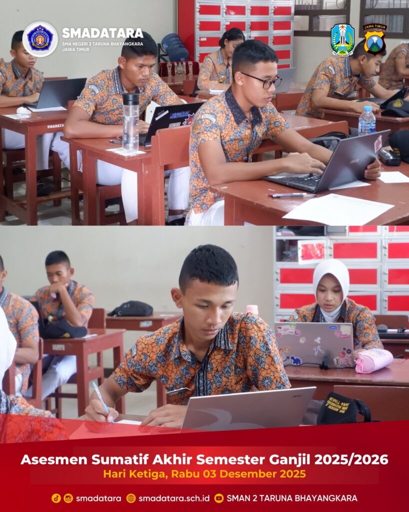 SMAN 2 Taruna Bhayangkara Jawa Timur kembali melanjutkan rangkaian Asesmen Sumatif Akhir Semester (ASAS) Ganjil Tahun Ajaran 2025/2026 pada hari ketiga pelaksanaan. Seluruh kegiatan berjalan tertib dan lancar, mencerminkan budaya disiplin dan suasana akademik yang positif di lingkungan Ksatrian.