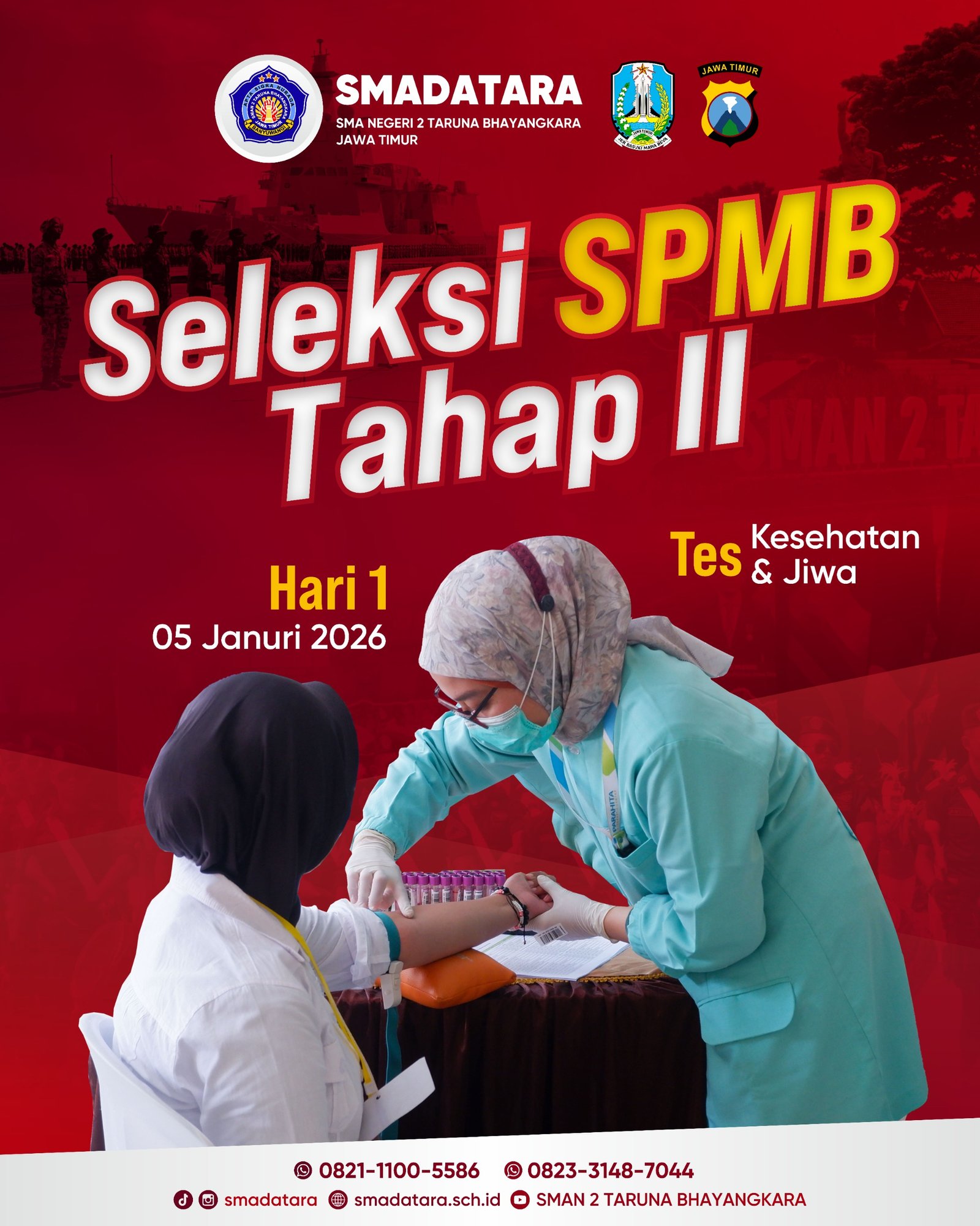 Pada hari ini, Senin, 05 Januari 2026, SMAN 2 Taruna Bhayangkara Jawa Timur melaksanakan Seleksi Sistem Penerimaan Murid Baru (SPMB) Tahap 2. Pada tahap ini, calon taruna mengikuti rangkaian tes Kesehatan dan Jiwa sebagai bagian dari proses seleksi menuju pendidikan ketarunaan.