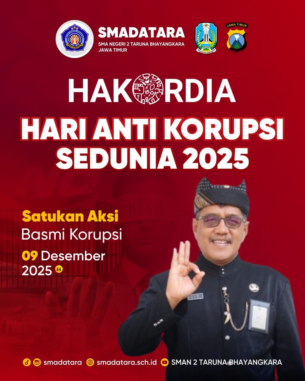 SMAN 2 Taruna Bhayangkara Jawa Timur turut memperingati Hari Antikorupsi Sedunia (Hakordia) 2025, yang jatuh pada 9 Desember. Tahun ini, sekolah mengusung semangat “Satukan Aksi, Basmi Korupsi” sebagai bentuk dukungan terhadap gerakan nasional pemberantasan korupsi.