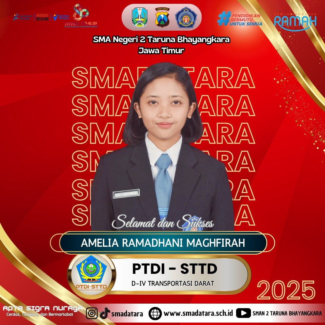 Kabar membanggakan kembali datang dari SMAN 2 Taruna Bhayangkara Jawa Timur. Salah satu taruni terbaik, Amelia Ramadhani Maghfirah, berhasil lolos seleksi dan resmi diterima di Politeknik Transportasi Darat Indonesia – Sekolah Tinggi Transportasi Darat (PTDI–STTD) pada jurusan D-IV Transportasi Darat.
